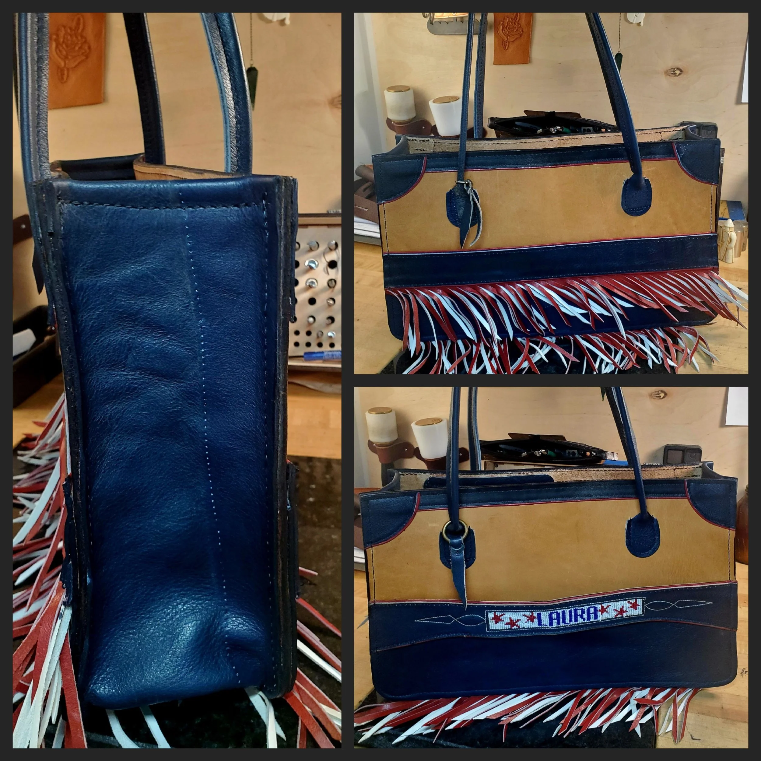 As the build went on I found some creative uses for hardware and various portions of the leather. The zipper pulls and hardware around the zippers I repurposed. They became decorative tassels one on each side of the bag, hanging over the folded handles again built from her chap leather The original makers tag, and bolt snap went inside the bag alongside my own makers tag. I like to think it helps preserve the history of the chaps used in the bag, while building on it with my own work. I reused all of the piping from the chaps as decorative applique on the panels to make the blue pop against the veg tan, and added fringe to decorate the reverse pocket. All of that added together to create a challenge and interesting build, that the customer absolutely adores.